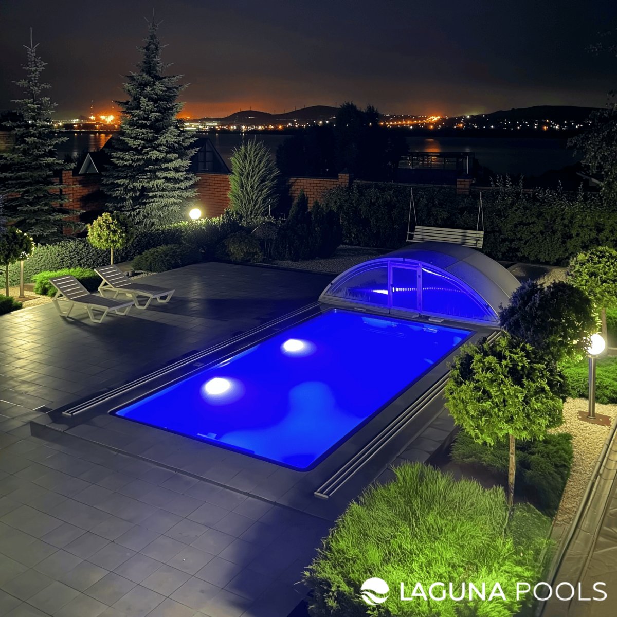 Прямоугольный бассейн с ярко-синей подсветкой частично закрыт раздвижным куполом на прилегающей территории.
